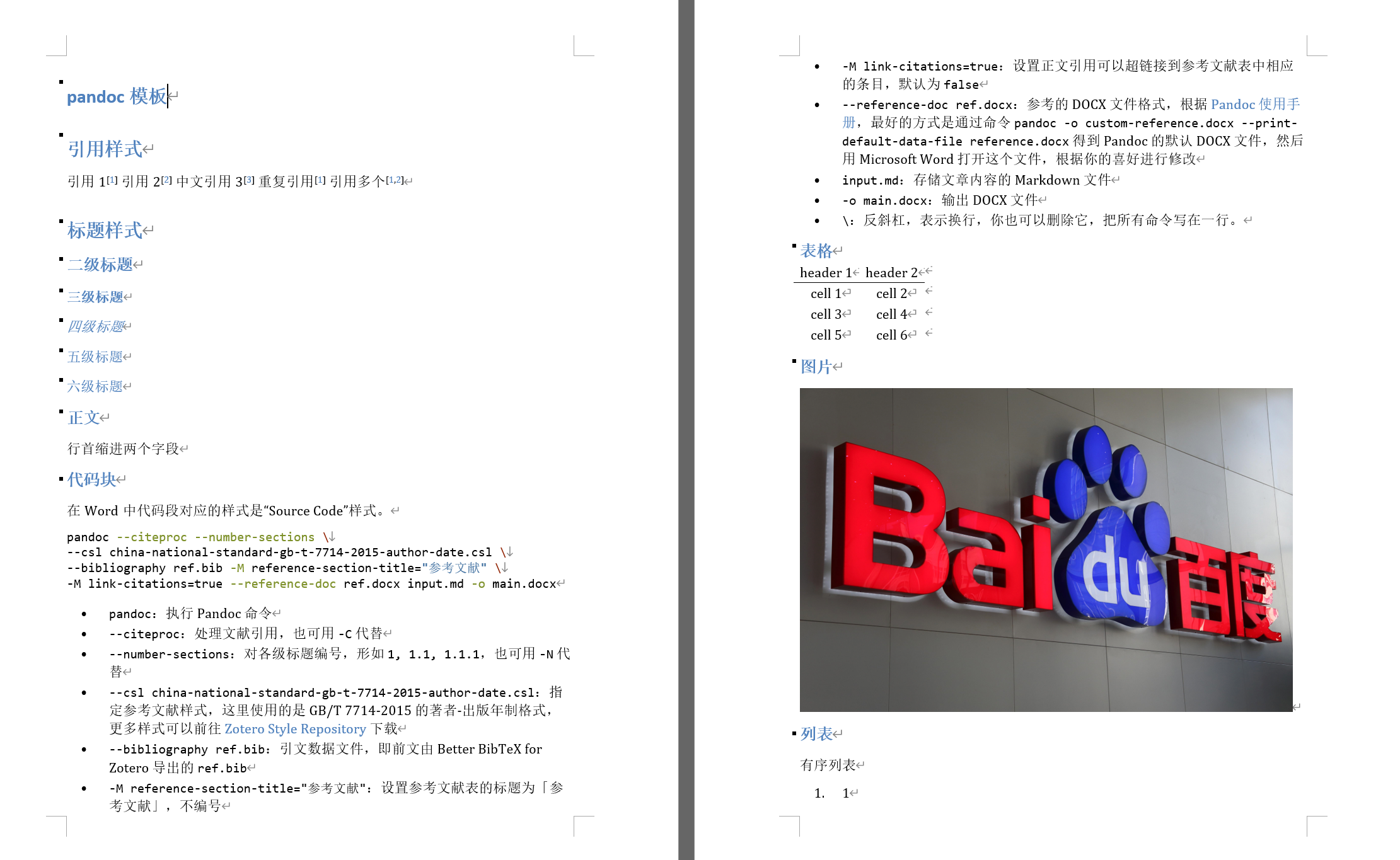 另外我给这份模板还自动加了编号,这是因为我觉得 pandoc 虽然本身有–number-sections 参数,但是这个只是人为加上的,编号不会随着标题变化而变化,其实没有大用。在 word 里给标题编号除了让结构更清晰以外,还有一个重要的作用是让表格和图片的题注自动编号!