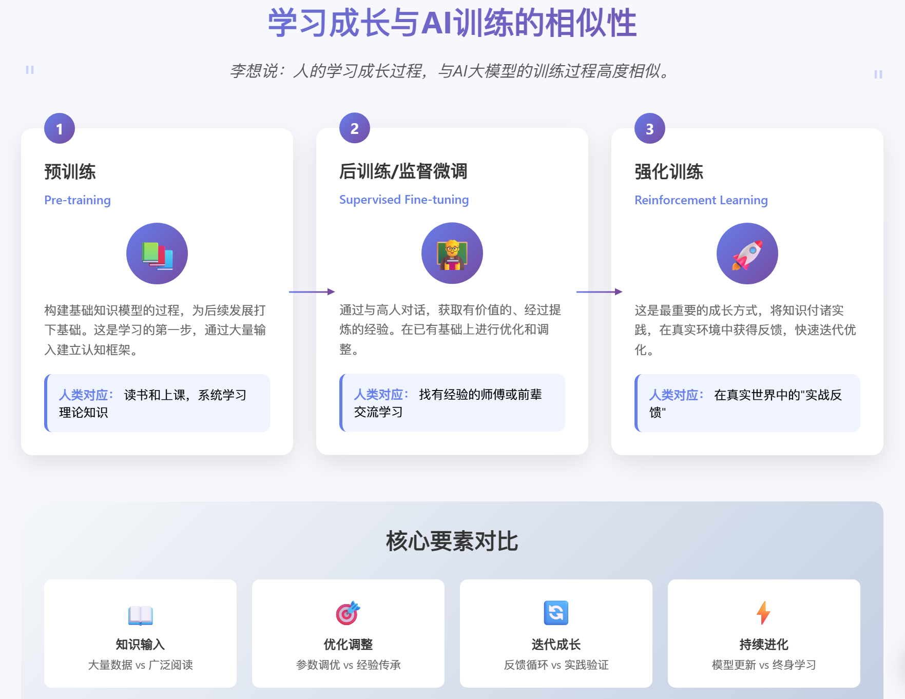 - 强化训练 (Reinforcement Learning) :相当于在真实世界中的“实战反馈” 。这是最重要的成长方式,即必须将产品推向市场,在实践中获得真实的用户反馈,然后基于反馈进行快速迭代。